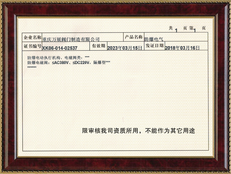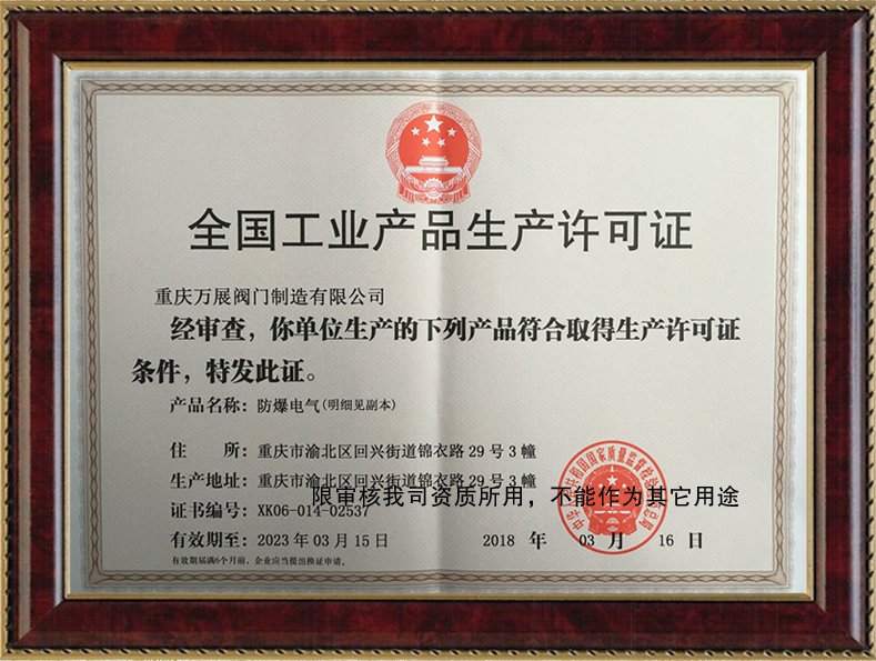 我司順利通過國家質(zhì)量監(jiān)督檢驗(yàn)檢疫總局的各項(xiàng)審核,成功取得了《全國工業(yè)產(chǎn)品生產(chǎn)許可證》,獲得了防爆電磁閥生產(chǎn)資格,促進(jìn)公司防爆電磁閥生產(chǎn)管理工作的制度化、規(guī)范化。